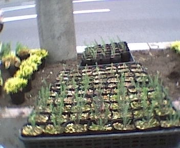 花壇への移植を待つ亜麻の苗